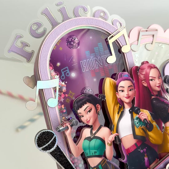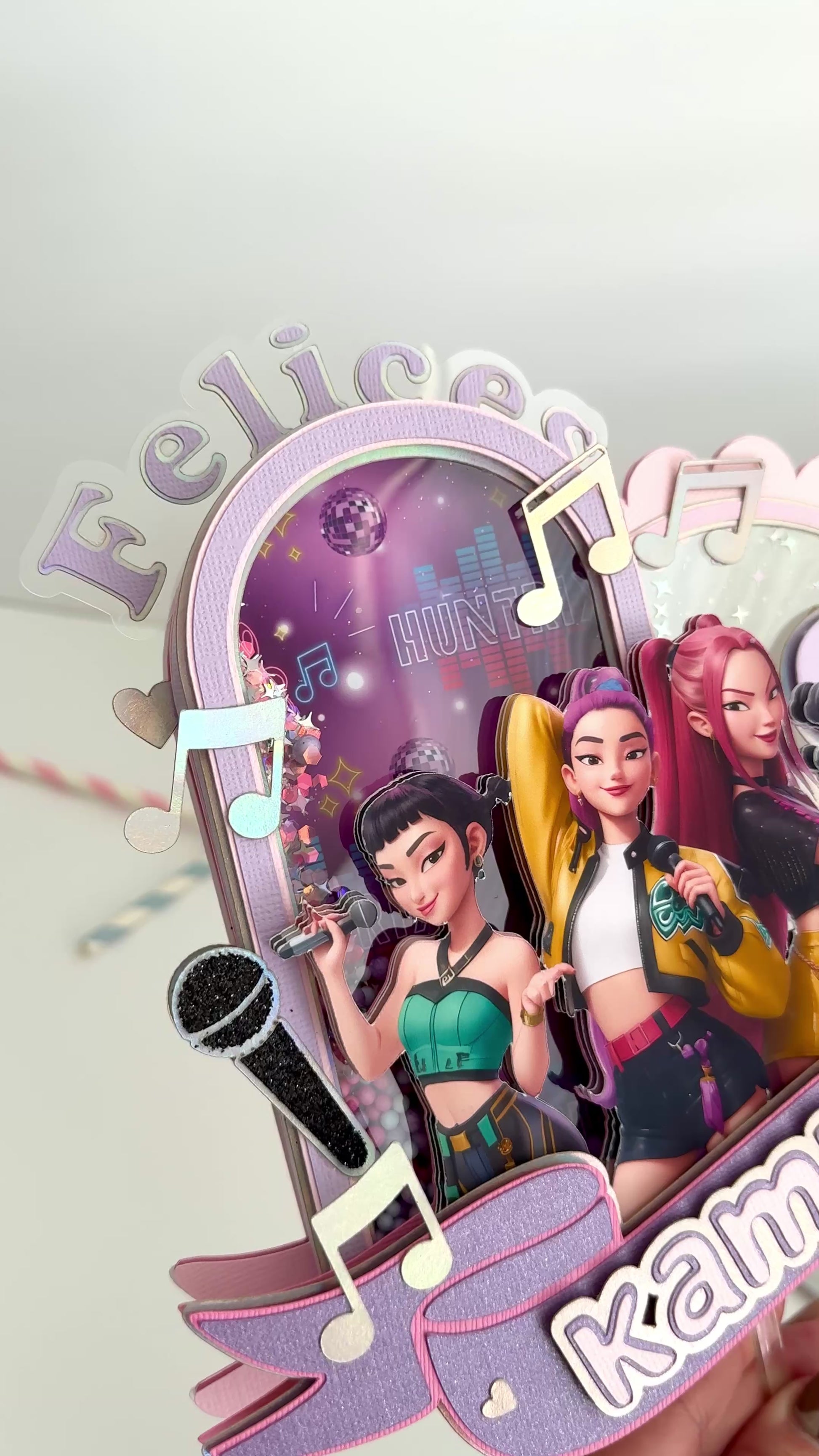 Celebra al estilo Kpop con este cake topper único y lleno de brillo. Perfecto para fans de las Kpop Hunters, este diseño incluye un divertido efecto shaker (con lentejuelas y detalles que se mueven), que hará que tu pastel luzca espectacular.